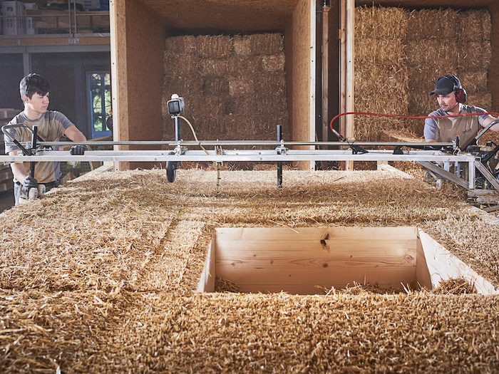 Préparation de murs de paille en Suisse. (c) Damian Poffet