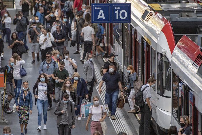 Lundi 6 juillet en gare de Lucerne. Depuis ce lundi, tous les passagers des transports publics dans toute la Suisse devront porter un masque de protection contre la propagation du COVID-19. (KEYSTONE/Urs Flueeler)