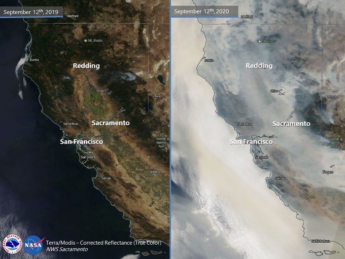 Le 12 septembre 2019 vs le 12 septembre 2020 sur la côté californienne | Nasa/NWS Sacramento